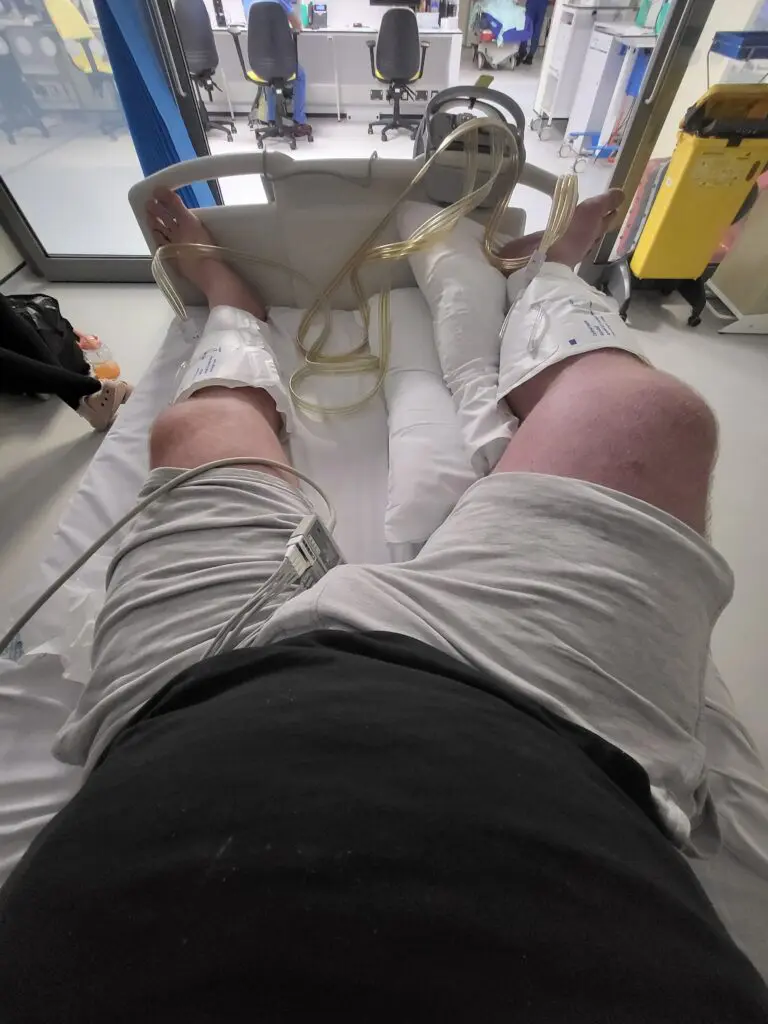 After arriving at hospital, they carried out a couple of routine checks including monitoring my heart rate and blood pressure. Then suddenly they moved me to resus as my heart rate had soared to 169bpm and I had a still unknown issue with my leg. They were concerned it could be ‘compartment syndrome’ as it looked like I could have a severe clot.