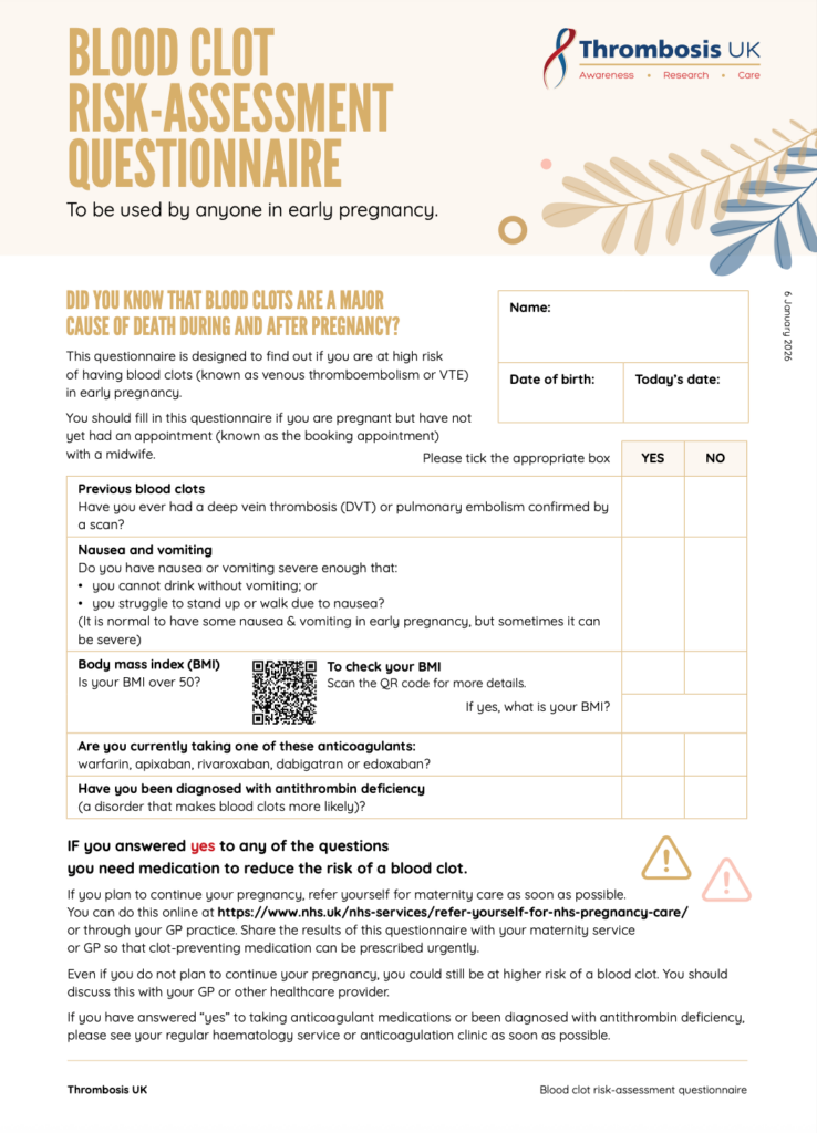 Thrombosis UK is delighted to be partnering with NHS England to improve the prevention of blood clots in early pregnancy. This questionnaire is designed to …